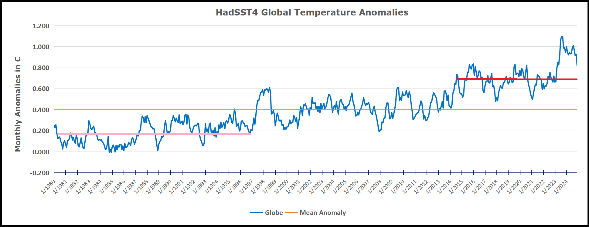 HadSST is generally regarded as the best of the global SST data sets, and so the temperature story here comes from that source. Previously I used HadSST3 for these reports, but Hadley Centre has made HadSST4 the priority, and v.3 will no longer be updated. HadSST4 is the same as v.3, except that the older data from ship water intake was re-estimated to be generally lower temperatures than shown in v.3. The effect is that v.4 has lower average anomalies for the baseline period 1961-1990, thereby showing higher current anomalies than v.3. This analysis concerns more recent time periods and depends on very similar differentials as those from v.3 despite higher absolute anomaly values in v.4. More on what distinguishes HadSST3 and 4 from other SST products at the end. The user guide for the current version HadSST4.1.1.0 is here. The charts and analysis below is produced from the current data.