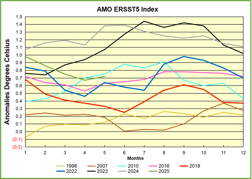 Then in 2024 the AMO anomaly started higher than any previous year, then leveled off for two months declining slightly into April. Remarkably, May showed an upward leap putting this on a higher track than 2023, and rising slightly higher in June. In July, August and September 2024 the anomaly declined, and despite a small rise in October, ended close to where it began. Note 2025 started much lower than the previous year and is headed sharply downward, well below the previous two years, now in May aligning with 2010.