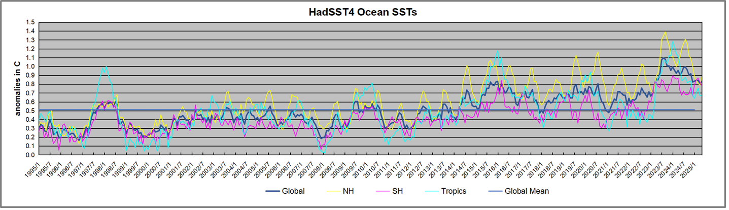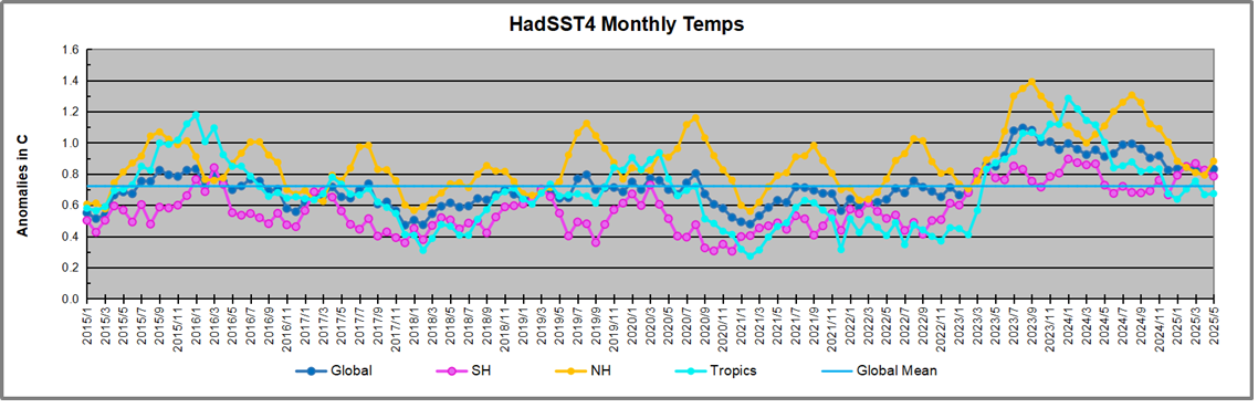 The chart below shows SST monthly anomalies as reported in HadSST4 starting in 2015 through May 2025. A global cooling pattern is seen clearly in the Tropics since its peak in 2016, joined by NH and SH cycling downward since 2016, followed by rising temperatures in 2023 and 2024.