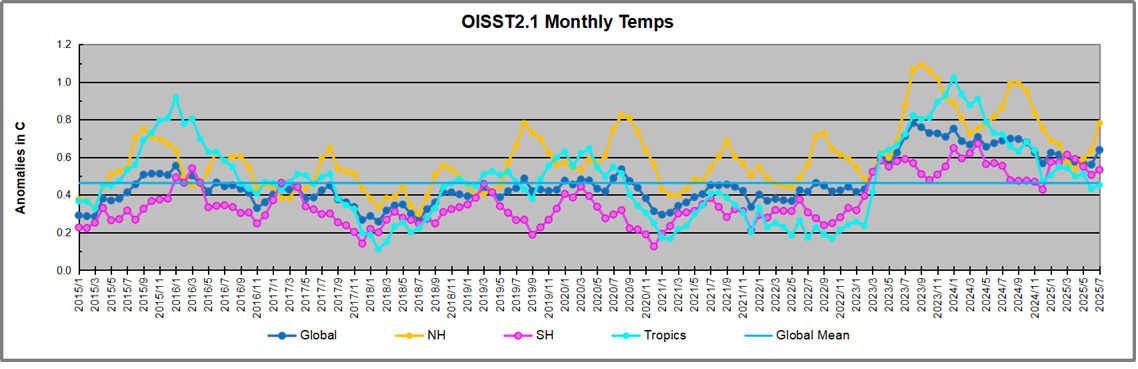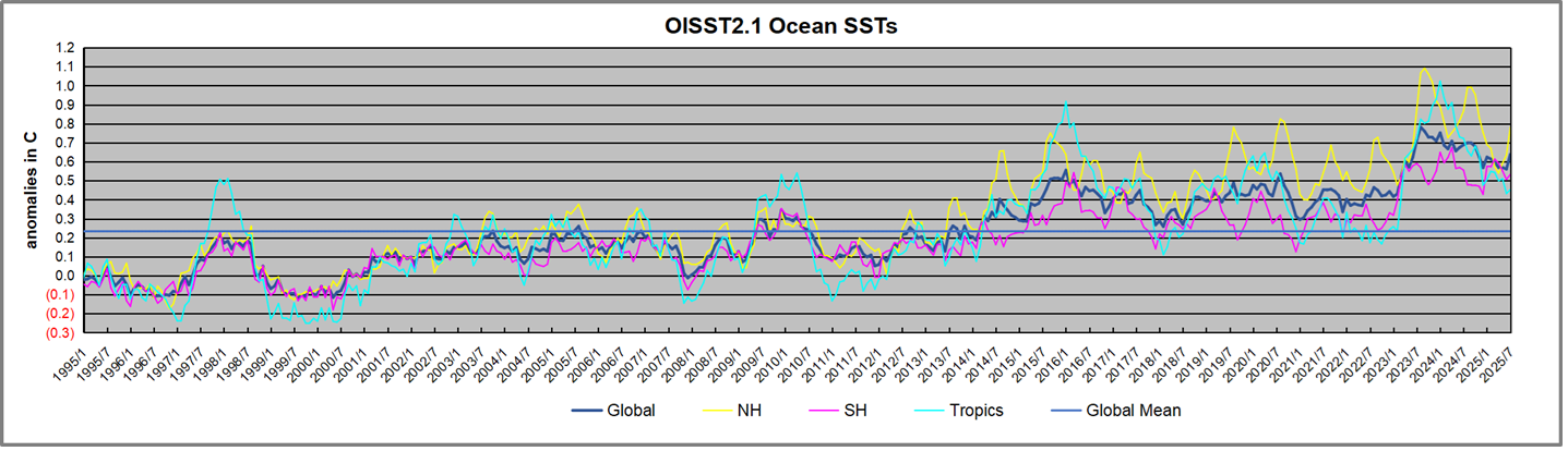 As for surface temperatures, the research by Humlum et al. concluded that changes in atmospheric temperature are an ‘effect’ of changes in SSTs and not a ‘cause’ as some might advocate. And Humlum’s ‘take home’ message from a recent presentation was:
