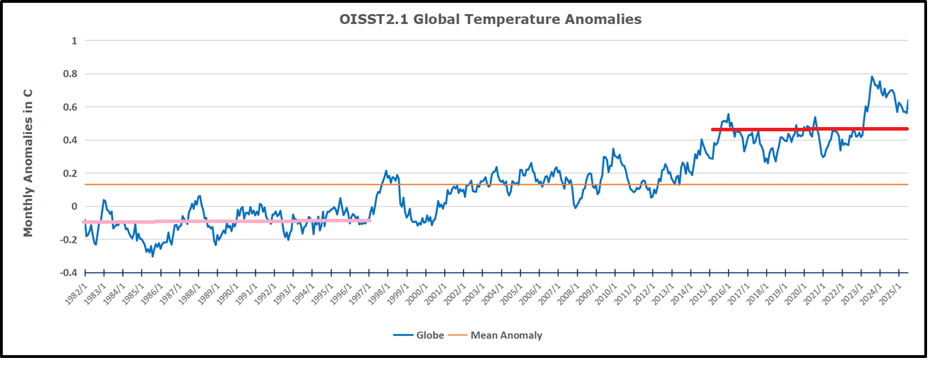 Robbins, 2025 Figure 2: Global tropic SSTs overlaid onto monthly atmospheric CO2 increases (Mauna Loa)