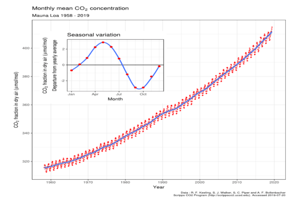 Fig. 1. The Keeling curve of atmospheric CO2 partial pressure at 3200 m on Mauna Loa, Hawaii. Data from Dr. Pieter Tans, NOAA/ESRL and Dr.Ralph Keeling, Scripps Institution of Oceanography.CC BY-SA 4.0,https://commons.wikimedia.org/w/index.php?curid=40636957
