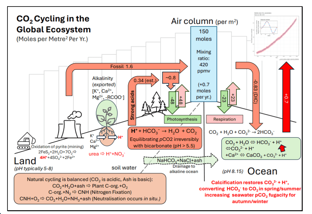 Fig. 5. Rates per square meter in global carbon cycling between land water, the atmosphere, and the ocean, illustrating the pH-acidification hypothesis. Emissions and absorptions shown are average moles per square meter of the Earth, for a mixing ratio of 420 ppmv in 2021 shown in the central column bridging land and ocean. The land acidification values are derived elsewhere (11), assuming photosynthesis is equal to respiration. The terrestrial area of Earth is 1.48×1014 m-2 , the ocean’s area is 3.62×1014 m2 , 5.101 x1014 m2 in total., represented as a mean value in the central air column.