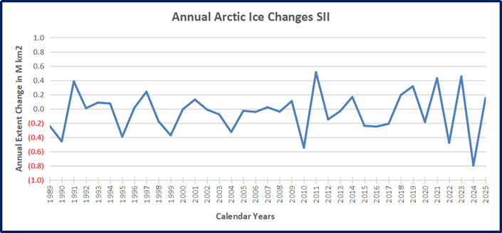 As many know, there has been a decline of Arctic ice extent over these 40 years, averaging 70k km2 per year. But year over year, the changes shift constantly between gains and losses, ranging up to +/- 500k km2, (2024 being exceptional). Since 1989 the average yearend gain/loss is nearly zero, -0.049k km2 to be exact.
