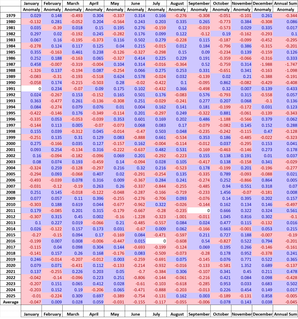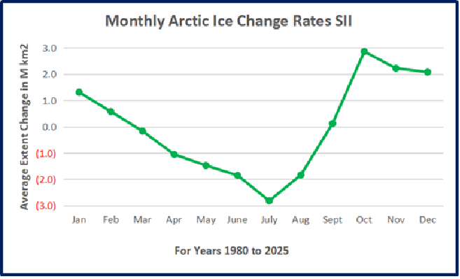 Note that the +/ – rate anomalies are distributed all across the grid, sequences of different months in different years, with gains and losses offsetting one another. As noted earlier, in 2023 the outlier negative months were June through September where unusual amounts of ice were lost. Then unusally strong gains in October to December resulted in a large annual gain, compared to the baseline. The bottom line presents the average anomalies for each month over the period 1979-2025. Note the rates of gains and losses mostly offset, and the average of all months in the bottom right cell is virtually zero.