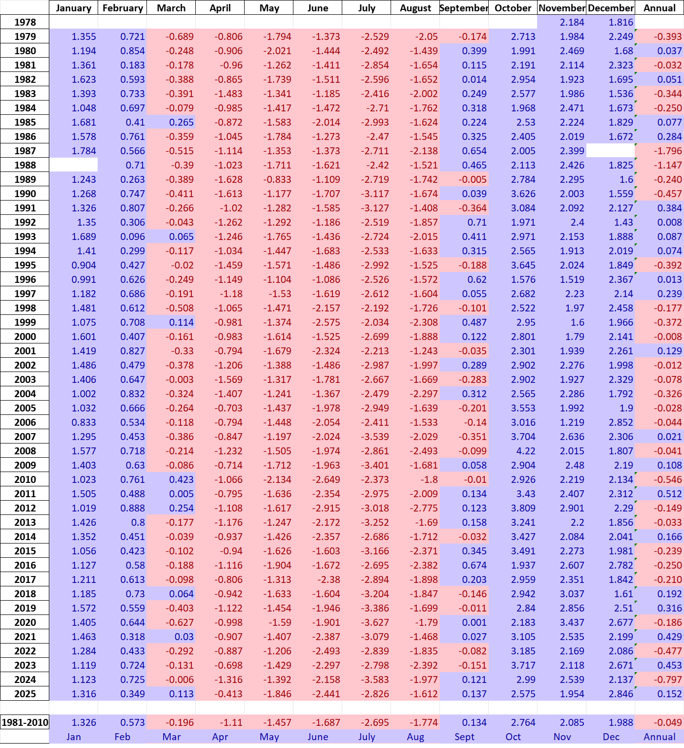 As it happens in this dataset, October has the highest rate of adding ice. The table below shows the variety of monthly rates in the record as anomalies from the 1980-2010 baseline. In this exhibit a red cell is a negative anomaly (less than baseline for that month) and blue is positive (higher than baseline).