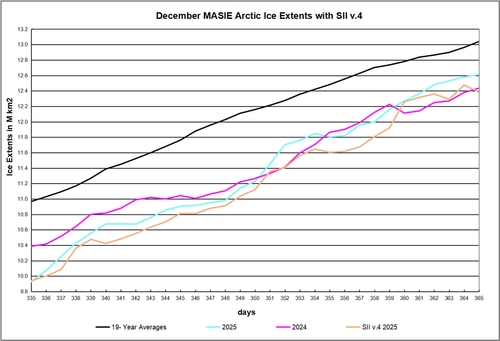The Arctic ice extents are now fully reported for 2025, ending the year below average despite a higher rate of growth through December.