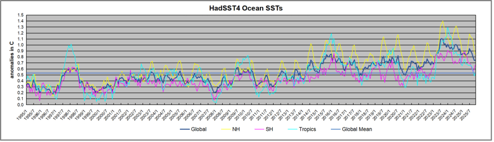 Previously I used HadSST3 for these reports, but Hadley Centre has made HadSST4 the priority, and v.3 will no longer be updated. I’ve grown weary of waiting each month for HadSST4 updates, so the July and August reports were based on data from OISST2.1. This dataset uses the same in situ sources as HadSST along with satellite indicators. Now however, the US government is shut down and updates to climate datasets are likely to be delayed. Reminds of what hospitals do when their budgets are slashed: They close the Maternity Ward to get public attention.