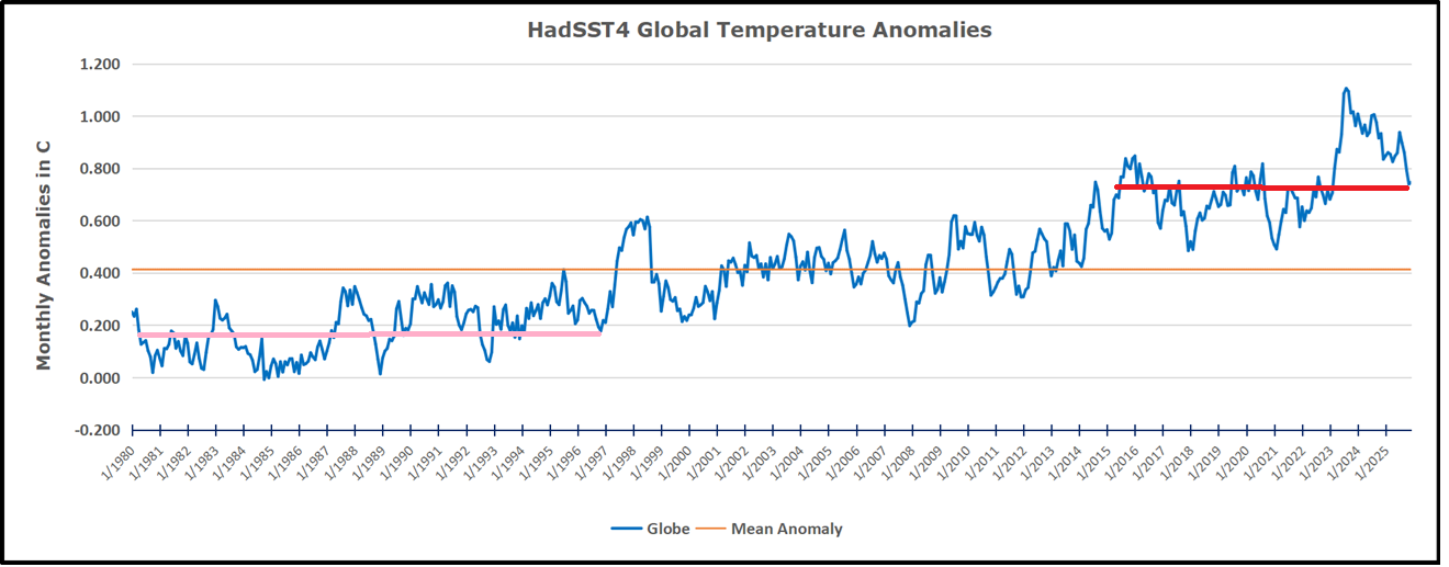 The rose line is the average anomaly 1982-1996 inclusive, value 0.18. The orange line the average 1982-2025, value 0.41 also for the period 1997-2012. The red line is 2015-2025, value 0.74. As noted above, these rising stages are driven by the combined warming in the Tropics and NH, including both Pacific and Atlantic basins.
