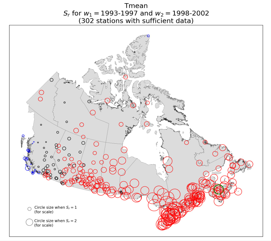 Figure 7: Map showing Sr calculated using Tmean, for the break year 1998 with two five-year windows (1993-1997 and 1998-2002) for the 302 3rd generation AHCCD stations with sufficient data. Circle radius is proportional to the absolute value of Sr. Circle colour indicates Sr ranges as follows: blue: Sr < 0; black: 0 ≤ Sr ≤ 1; red: Sr > 1. Moncton, NB (Sr = 2.74) is indicated with a green circle, for reference.