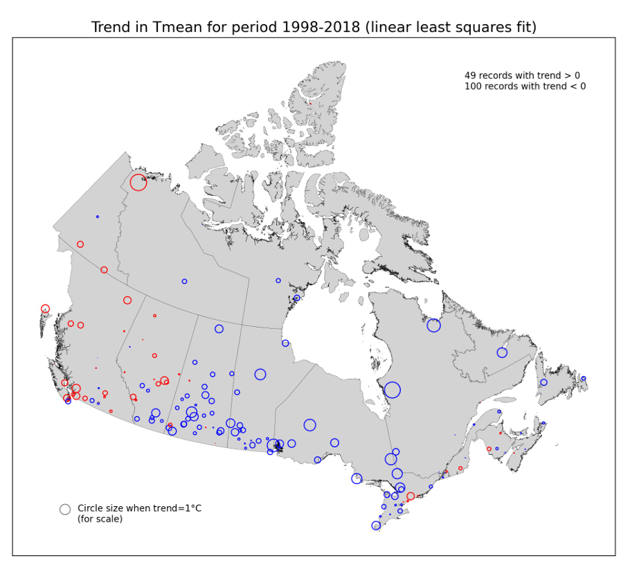 Figure 8: Map of trend in Tmean over the period 1998-2018, for the 3rd generation AHCCD stations with sufficient data, calculated using linear least-squares fitting. Circle radius is proportional to the absolute value of the trend. Blue circles correspond to negative trends (trend < 0) and red circles to positive trends (trend > 0).