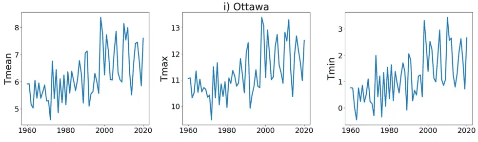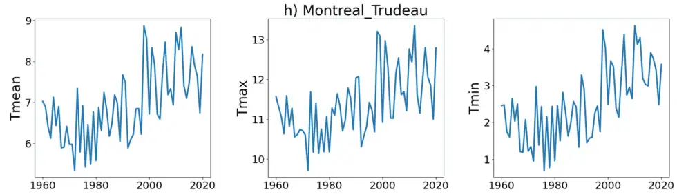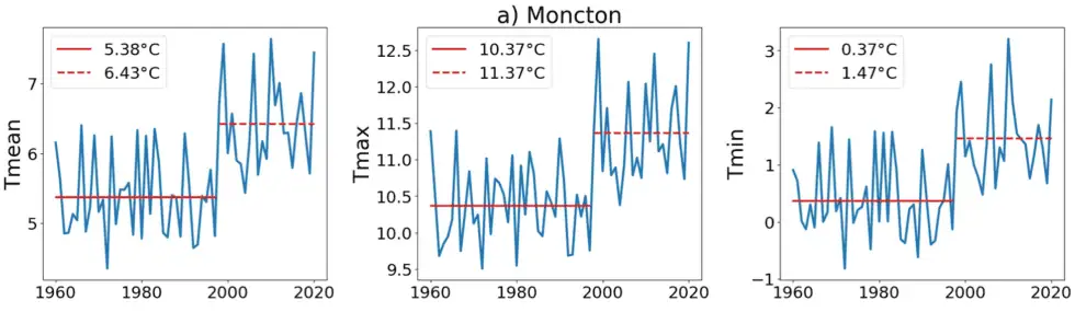 In 2021, Dr. Joseph Hickey, a data scientist with a PhD in Physics, specializing in complexity science, then an employee of the Bank of Canada, alerted ECCC to this one-degree jump in temperature data across much of Canada, and asked for an explanation. The below graphs of mean, maximum and minimum temperatures constructed with data from three Canadian cities—Moncton (on which Hickey illustrates the step change with red lines), Ottawa and Montreal—are samples of those created by Hickey using ECCC data downloaded on November 11, 2025, data that is the same as that he sent to ECCC researchers as an attachment to his email of June 24, 2021.