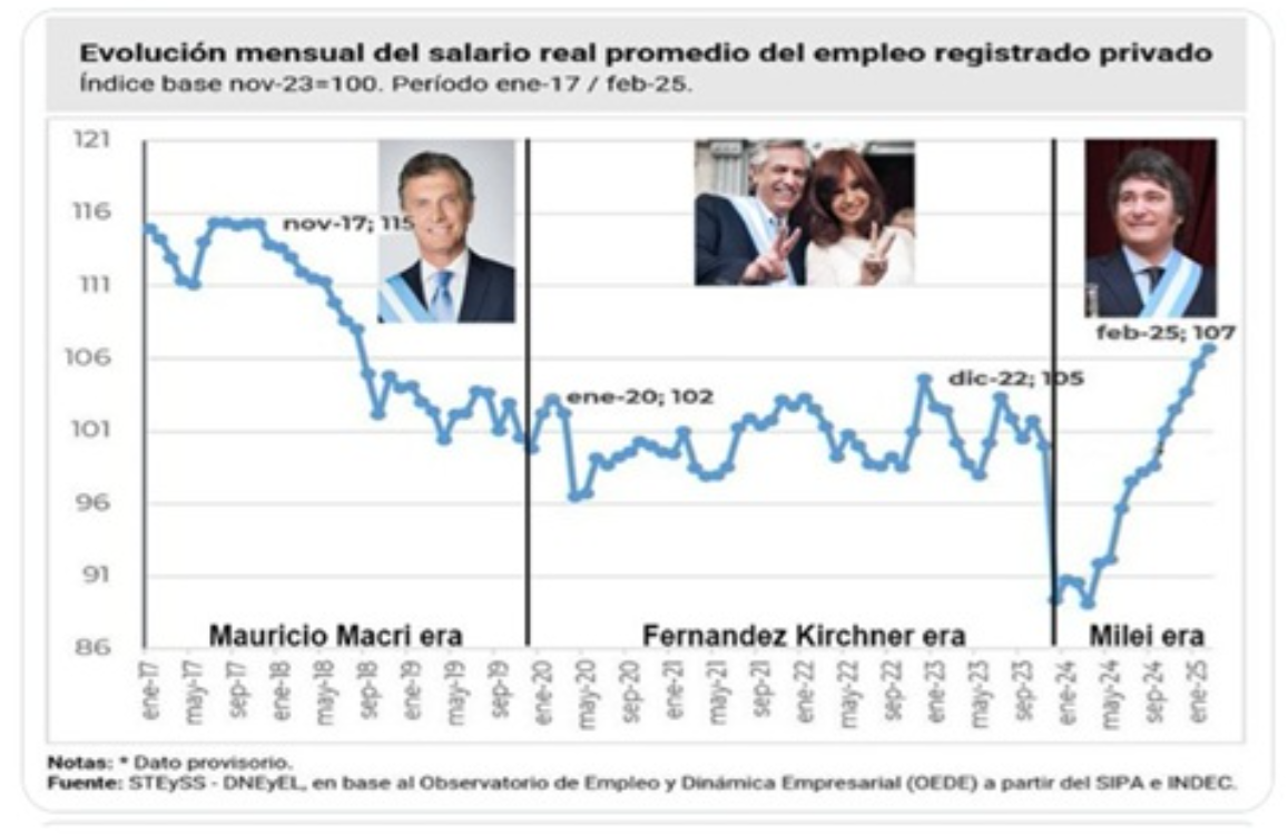 Real wages for Argentina’s registered private sector workers reached 107 on the index (base 2023=100) in February 2025, the highest since August 2018, according to the Observatory of Employment and Business Dynamics.