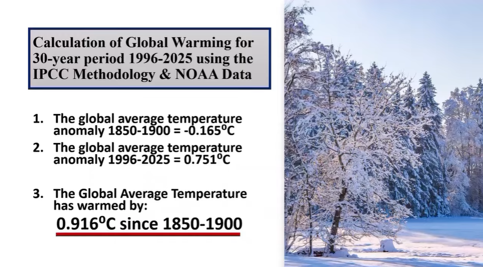 The global average temperature anomaly for the 30 year period 1996 to 2025 equals plus 0.751 degrees Celsius. Therefore, the global average temperature has warmed by 0.916 degrees Celsius since 1850 to 1900. This is a large discrepancy from the NOAA 2025 report of 1.34 degrees Celsius.