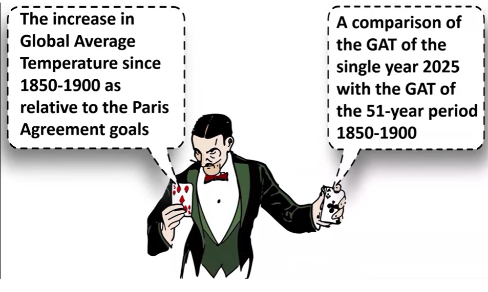 But in fact, we are merely being informed of a comparison of the global average temperature of the single year 2025 with the global average temperature of the 51-year period 1850-1900. A comparison which is absolutely irrelevant with respect to the Paris Agreement goals. And quite emphatically, does nothing to answer the questions how much has global average temperature increased since the pre-industrial period 1850-1900 and how does this increase compare to the Paris Agreement overarching goals?