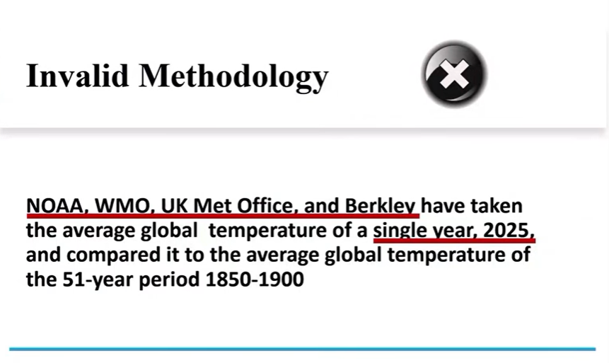 This is an invalid methodology that produces the exact results these organisations have duly reported. This can be demonstrated quite easily by again using NOAA data but substituting the 30-year period 1996-2025 with the 1-year period 2025-2025. The global average temperature anomaly 1850-1900 remains the same at minus 0.165 degrees celsius.