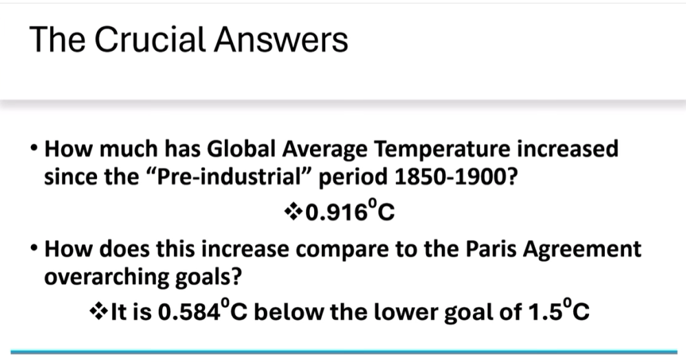 How much has global average temperature increased since the pre-industrial period 1850-1900? 0.916 degrees celsius. How does this increase compare to the Paris Agreement overarching goals? It is 0.584 degrees celsius below the lower limit of 1.5 degrees celsius. That concludes the main points of this video but we could not resist a two-minute post-script.