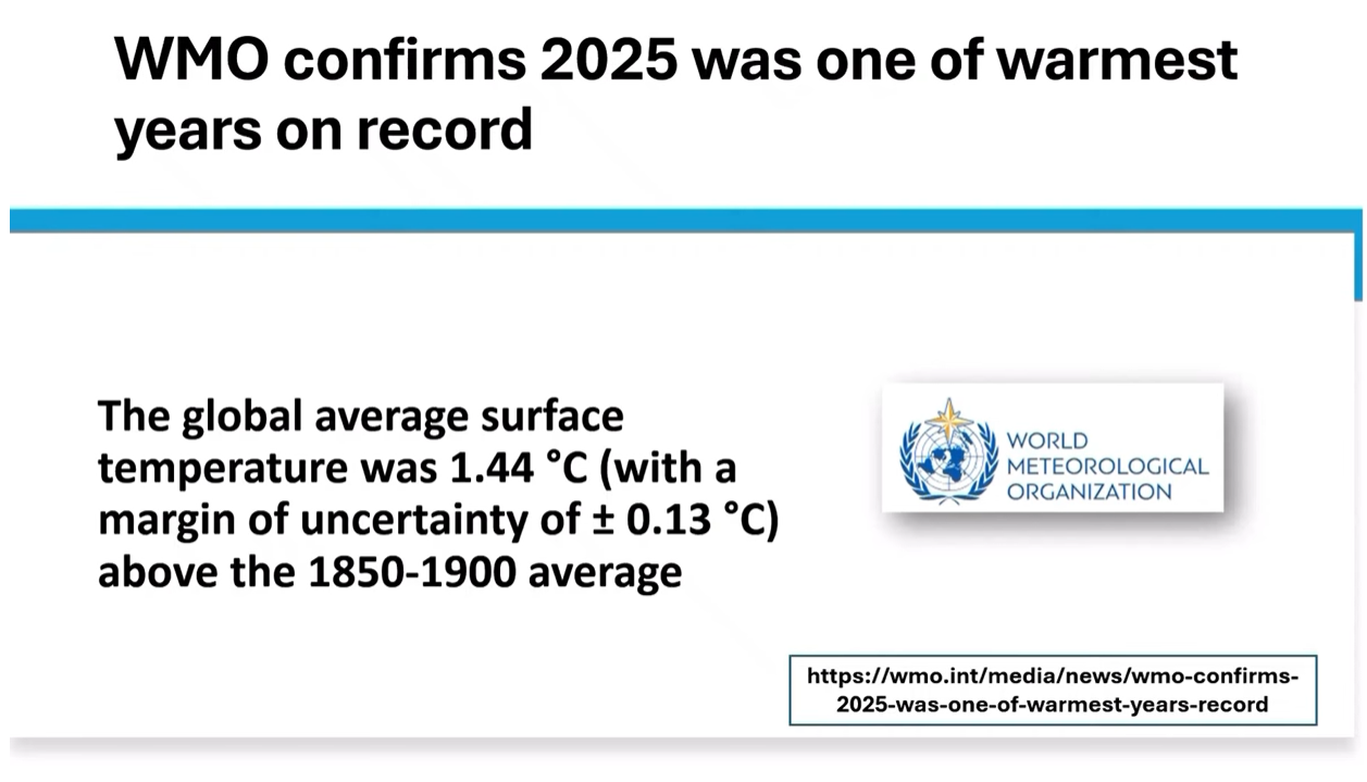 Berkeley Earth reported that in 2025 the global annual average temperature was estimated at 1.44 degrees Celsius above pre-industrial levels. The WMO reported that the global average surface temperature was 1.44 degrees Celsius above the 1850 to 1900 average. The UK Met Office reported that 2025 was 1.41 degrees Celsius above the 1850 to 1900 global average.