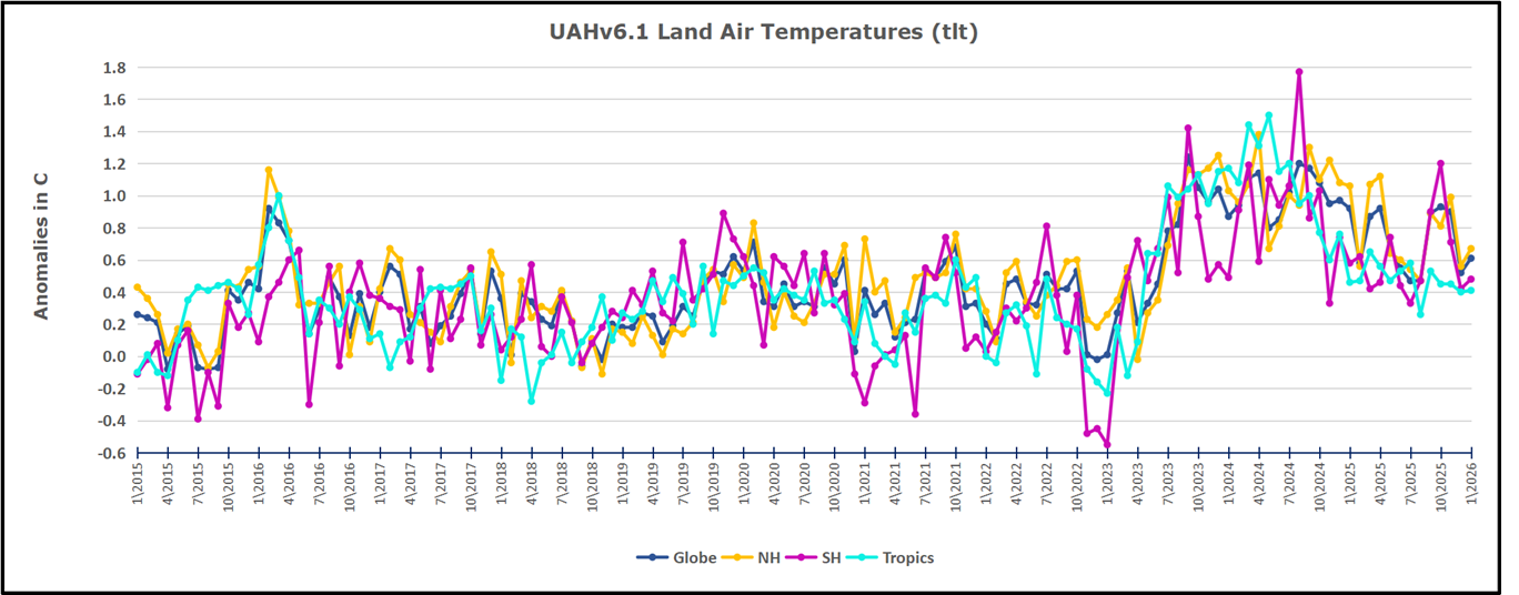 UAH has updated their TLT (temperatures in lower troposphere) dataset for January 2026. Due to one satellite drifting more than can be corrected, the dataset has been recalibrated and retitled as version 6.1 Graphs here contain this updated 6.1 data. Posts on their reading of ocean air temps this month are ahead the update from HadSST4 or OISST2.1. I posted recently on SSTs December 2025 All Ocean SSTs Cool to Mean. These posts have a separate graph of land air temps because the comparisons and contrasts are interesting as we contemplate possible cooling in coming months and years.