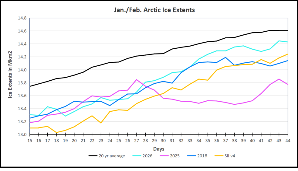 The chart below shows the 20-year averages for Arctic ice extents mid-Febrauary along with 2026 and 2025, as well as SII v.4.