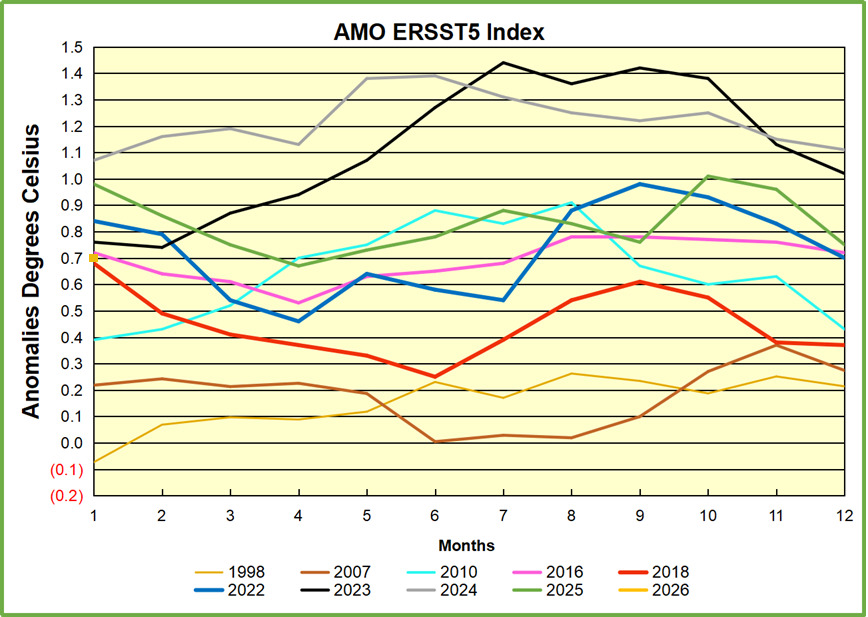 Then in 2024 the AMO anomaly started higher than any previous year, then leveled off for two months declining slightly into April. Remarkably, May showed an upward leap putting this on a higher track than 2023, and rising slightly higher in June. In July, August and September 2024 the anomaly declined, and despite a small rise in October, ended close to where it began. Note 2025 started much lower than the previous year and headed sharply downward, well below the previous two years, then since April through September aligning with 2010. In October there was an unusual upward spike, now reversed down to match 2022 and 2016. An orange dot on the left axis represents the value of 0.71C for January 2026