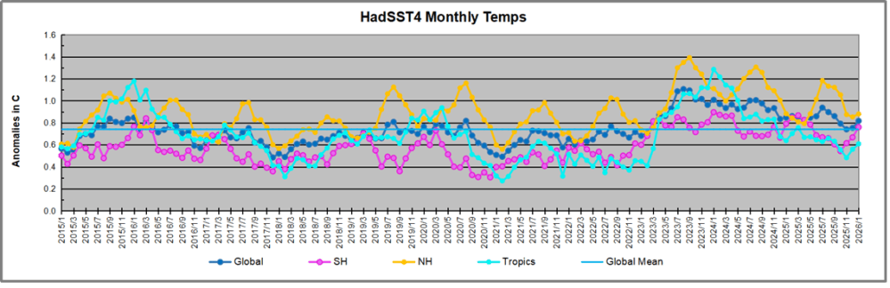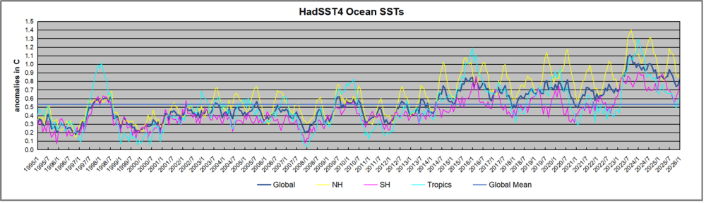 The chart below shows SST monthly anomalies as reported in HadSST 4.2 starting in 2015 through January 2026. A global cooling pattern is seen clearly in the Tropics since its peak in 2016, joined by NH and SH cycling downward since 2016, followed by rising temperatures in 2023 and 2024 and cooling in 2025, now with a small bump upward.