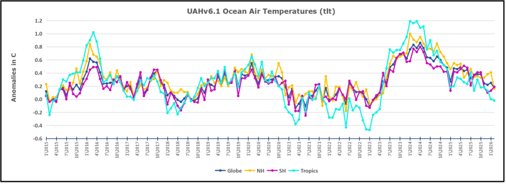 Sometimes air temps over land diverge from ocean air changes. In July 2024 all oceans were unchanged except for Tropical warming, while all land regions rose slightly. In August we saw a warming leap in SH land, slight Land cooling elsewhere, a dip in Tropical Ocean temp and slightly elsewhere. September showed a dramatic drop in SH land, overcome by a greater NH land increase. 2025 has shown a sharp contrast between land and sea, first with ocean air temps falling in January recovering in February. Then in November and December SH land temps spiked while ocean temps showed litle change. Now in February 2026 NH land temps doubled, from Dec. 0.53C up to 1.14C last month. Despite SH land changing little, and Tropical land cooling, the Global land anomaly jumped up from 0.53 to 0.93C. Meanwhile ocean air temps dropped markedly in NH, and changed little elsewhere.