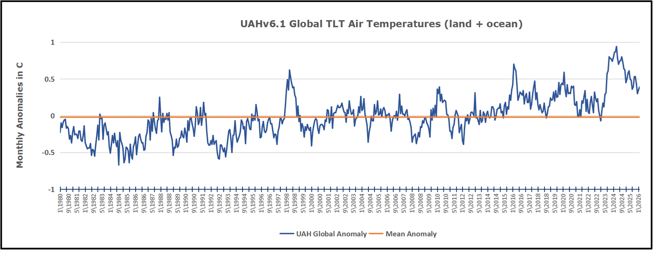 The post below updates the UAH record of air temperatures over land and ocean. Each month and year exposes again the growing disconnect between the real world and the Zero Carbon zealots. It is as though the anti-hydrocarbon band wagon hopes to drown out the data contradicting their justification for the Great Energy Transition. Yes, there was warming from an El Nino buildup coincidental with North Atlantic warming, but no basis to blame it on CO2.
