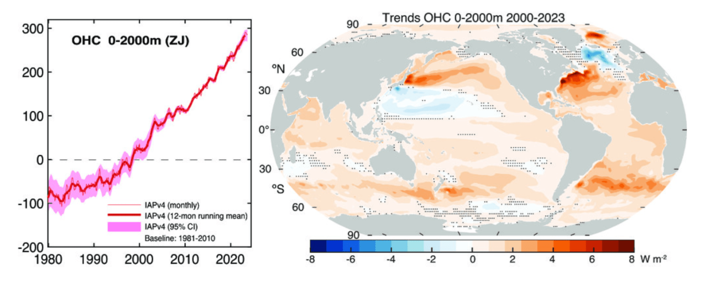 Fig. 1. (left) Global mean OHC (Cheng et al. 2024a) for 0–2000 m relative to a base period 1981–2010 (ZJ). The 95% confidence intervals are shown (sampling and instrumental uncertainties). (right) Trend from 2000 to 2023 in OHC for 0–2000 m (W m−2). The stippled areas show places where the trend is not significant at the 5% level. Source: Distinctive Pattern of Global Warming in Ocean Heat Content by Trenberth et al (2025).