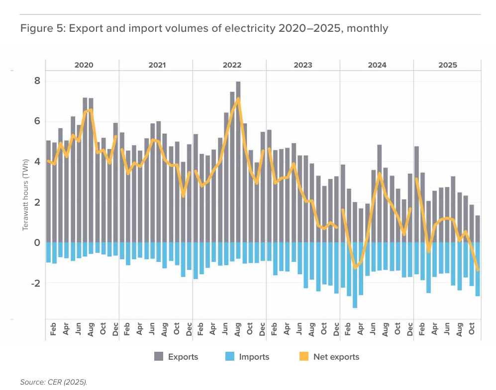 In 2016, Canada sent as much as 64 TWh in net electricity exports annually to the US. However, that number has steadily dwindled due to a combination of drought and the growth in domestic demand. Canada became a net importer of electricity for the first time in modern history in Spring 2024. By the end of 2025, Canada had become a regular net importer of electricity (see Figure 5). In 2025 both BC Hydro and Hydro-Québec were net importers – a previously unthinkable outcome.