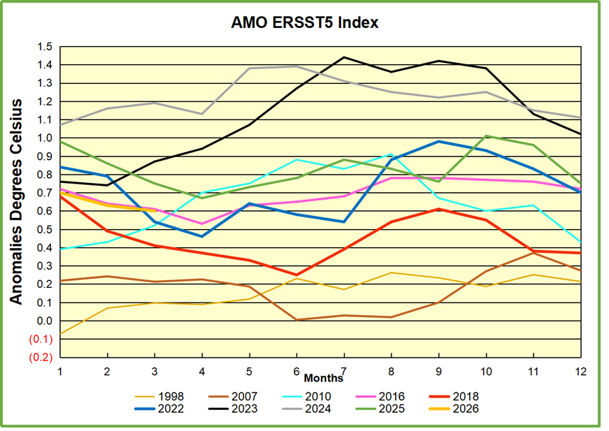 Through January 2023 I depended on the Kaplan AMO Index (not smoothed, not detrended) for N. Atlantic observations. But it is no longer being updated, and NOAA says they don’t know its future. So I find that ERSSTv5 AMO dataset has current data. It differs from Kaplan, which reported average absolute temps measured in N. Atlantic. “ERSST5 AMO follows Trenberth and Shea (2006) proposal to use the NA region EQ-60°N, 0°-80°W and subtract the global rise of SST 60°S-60°N to obtain a measure of the internal variability, arguing that the effect of external forcing on the North Atlantic should be similar to the effect on the other oceans.” So the values represent SST anomaly differences between the N. Atlantic and the Global ocean.