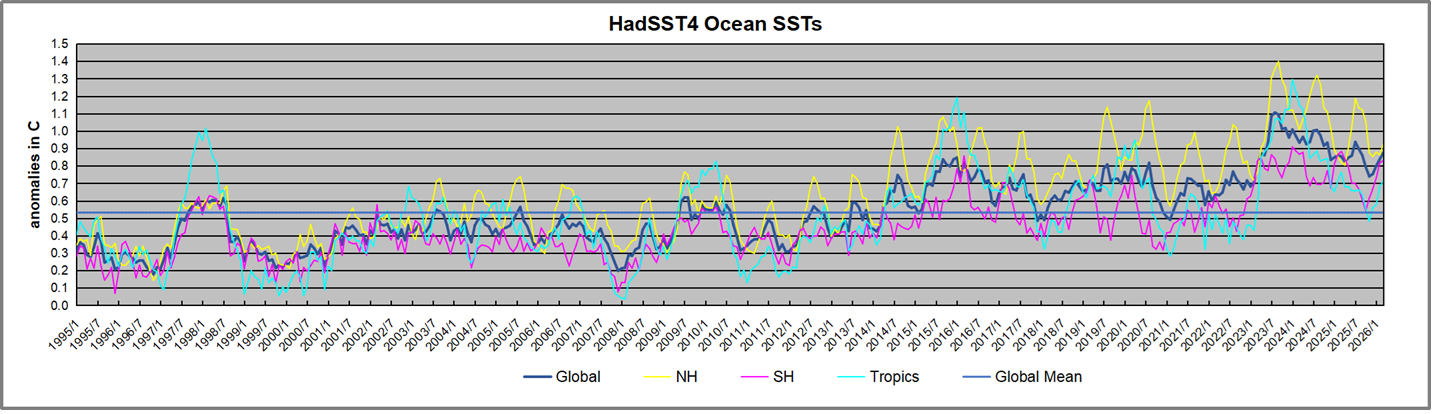 Previously I used HadSST3 for these reports, but Hadley Centre has made HadSST4 the priority, and v.3 will no longer be updated. This February report is based on HadSST 4, but with a twist. The data is slightly different in the new version, 4.2.0.0 replacing 4.1.1.0. Product page is here.