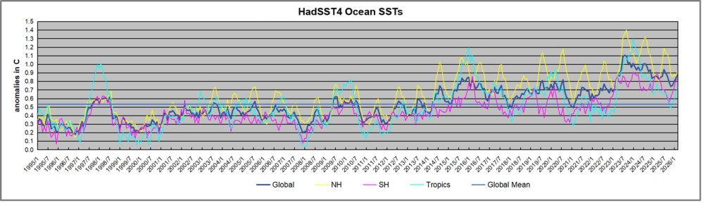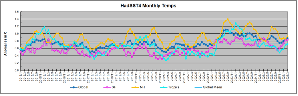 The chart below shows SST monthly anomalies as reported in HadSST 4.2 starting in 2015 through February 2026. A global cooling pattern is seen clearly in the Tropics since its peak in 2016, joined by NH and SH cycling downward since 2016, followed by rising temperatures in 2023 and 2024 and cooling in 2025, now with a mild rising in 2026.