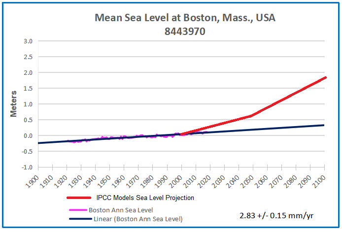 Taking the sea level rise projected by Sea Change Boston, and through the magic of CAI (Computer-Aided Imagining), we can compare to tidal gauge observations at Boston: