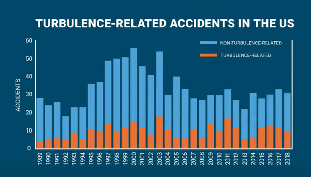 Here’s a chart of the number of turbulence-related accidents in the US from 1989 to 2018.