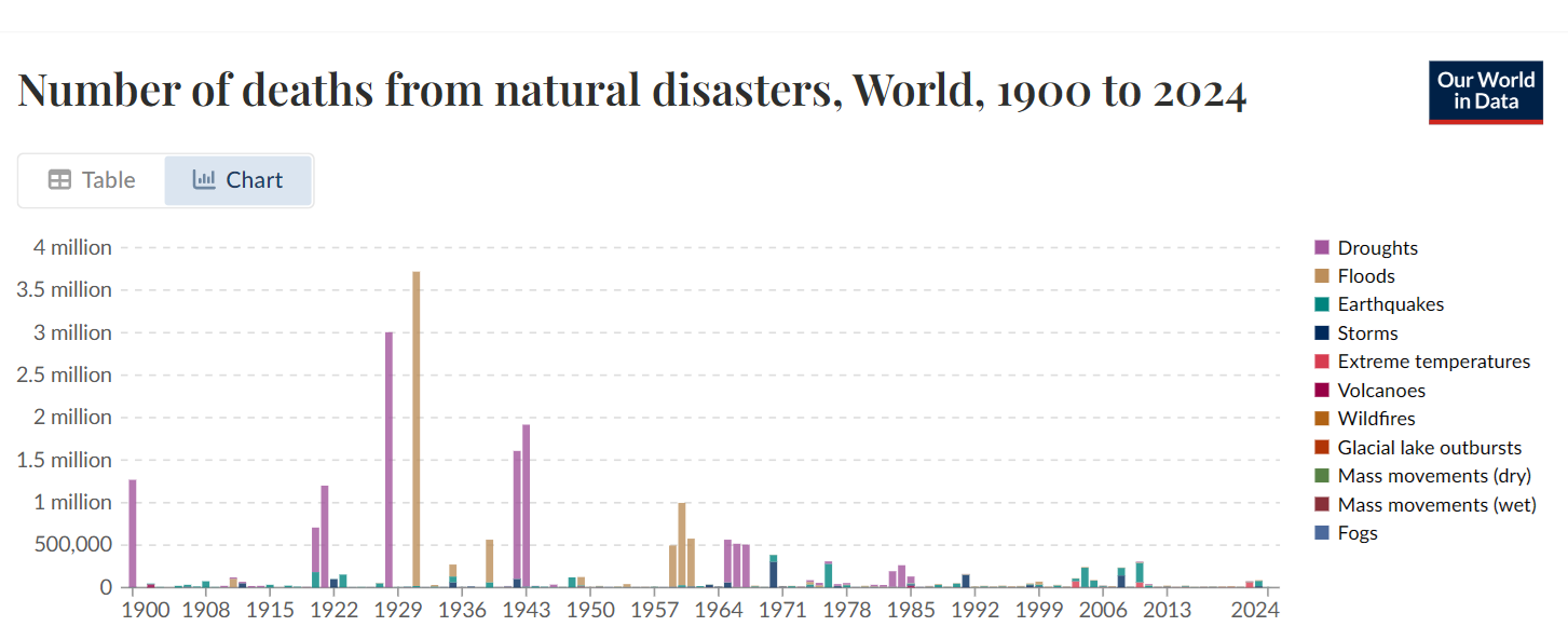 No Increase in Loss of Life: Deaths from meteorological, hydrological, and climatological disasters have not increased. This is a critical metric because it directly reflects the human impact of these events. Despite frequent claims that climate change is making weather more deadly, the data does not bear this out.