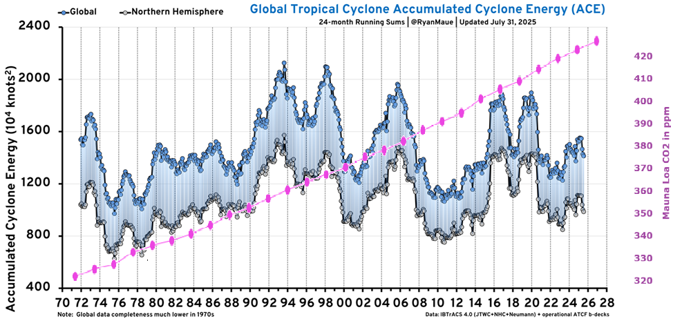 Then there is the Global Accumulated Cyclone Energy (ACE) report that includes the effects of both minor and major storms, combining strength and frequency.