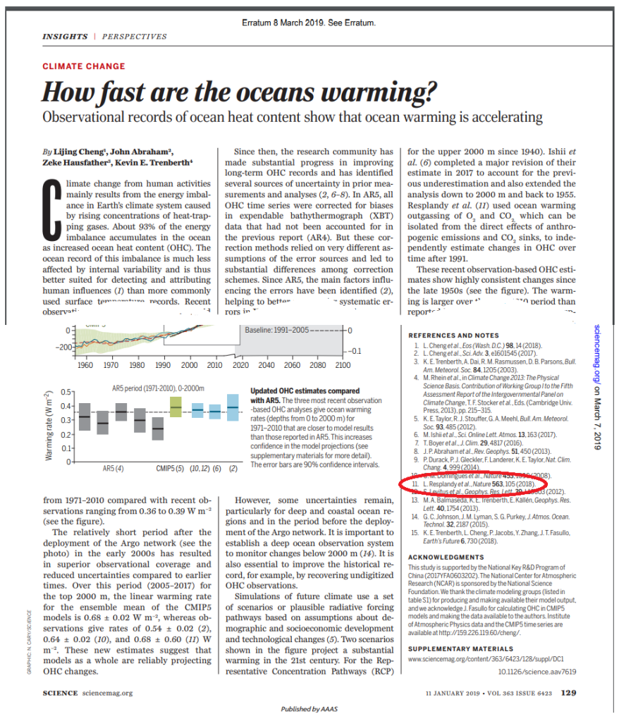 It started with Resplandy et al in 2018 who became an overnight sensation with their paper Quantification of ocean heat uptake from changes in atmospheric O2 and CO2 composition in Nature October 2018, leading to media reports of extreme ocean heating. Nic Lewis published a series of articles at his own site and at Climate Etc. in November 2018, leading to the paper being withdrawn and eventually retracted. Those authors acknowledged the errors and did the honorable thing at the time, resulting the paper’s retraction 25 September 2019.