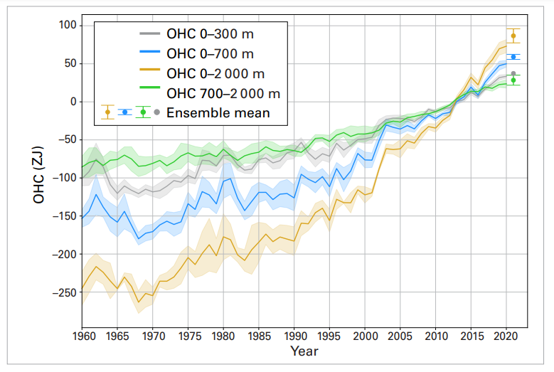 Figure 4. 1960–2021 ensemble mean time series and ensemble standard deviation (2 standard deviations, shaded) of global OHC anomalies relative to the 2005–2017 average for the 0–300 m (grey), 0–700 m (blue), 0–2 000 m (yellow) and 700–2 000 m (green) depth layers. The ensemble mean is an update of the outcome of a concerted international data and analysis effort.