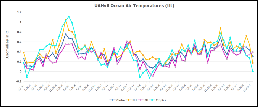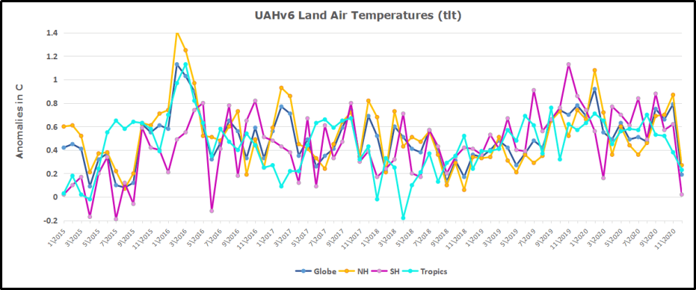 Here we have fresh evidence of the greater volatility of the Land temperatures, along with an extraordinary departure by SH land. Land temps are dominated by NH with a 2020 spike in February, followed by cooling down to July. Then NH land warmed with a second spike in November. Note the mid-year spikes in SH winter months. In December all of that was wiped out. Then January showed a sharp drop in SH, but a rise in NH more than offset, pulling the Global anomaly upward. In February NH and the Tropics cooled further, pulling down the Global anomaly, despite slight SH land warming. March continued to show all regions roughly comparable to early 2015, prior to the 2016 El Nino. With NH having most of the land mass, it’s possible the February Polar Vortex event drove air temps downward last month.
