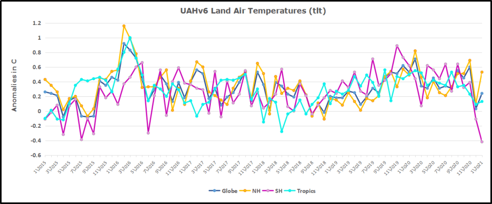 Here we have fresh evidence of the greater volatility of the Land temperatures, along with an extraordinary departure by SH land. Land temps are dominated by NH with a 2020 spike in February, followed by cooling down to July. Then NH land warmed with a second spike in November. Note the mid-year spikes in SH winter months. In December all of that was wiped out. Then January showed a sharp drop in SH, but a rise in NH more than offset, pulling the Global anomaly upward. Then in February to April NH and the Tropics cooled further, pulling down the Global anomaly, despite slight SH land warming. In May all regions warmed pulling up the Global anomaly from its lowest value since 2015. All regions are roughly comparable to early 2015, prior to the 2016 El Nino.