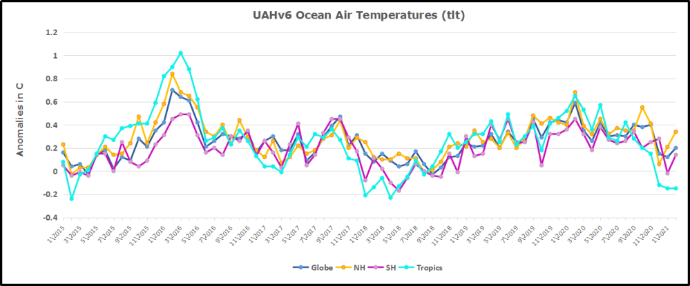 The UAH dataset includes temperature results for air above the oceans, and thus should be most comparable to the SSTs. There is the additional feature that ocean air temps avoid Urban Heat Islands (UHI). The graph below shows monthly anomalies for ocean temps since January 2015.