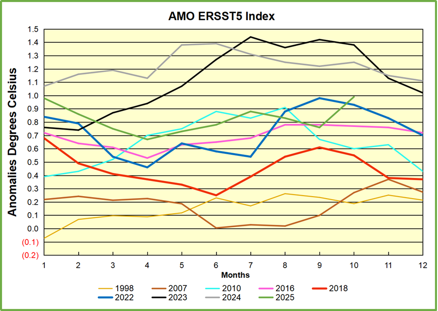 Then in 2024 the AMO anomaly started higher than any previous year, then leveled off for two months declining slightly into April.  Remarkably, May showed an upward leap putting this on a higher track than 2023, and rising slightly higher in June.  In July, August and September 2024 the anomaly declined, and despite a small rise in October, ended close to where it began.  Note 2025 started much lower than the previous year and headed sharply downward, well below the previous two years, then since April through September aligning with 2010, with an upward bump in October 2025.