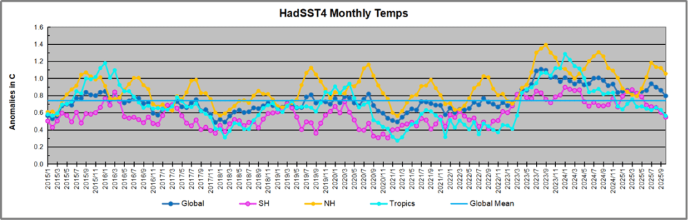The chart below shows SST monthly anomalies as reported in OISST2.1 starting in 2015 through October 2025.  A global cooling pattern is seen clearly in the Tropics since its peak in 2016, joined by NH and SH cycling downward since 2016, followed by rising temperatures in 2023 and 2024 and cooling in 2025.