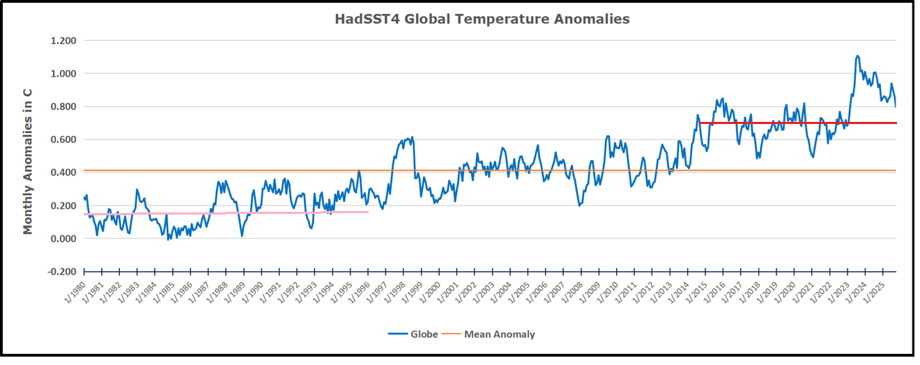 The chart shows how 2025 is tracking ~half a degree F cooler than 2024. That may not seem significant, except that the ocean covers 71% of the Earth’s surface, and any SST warming is reported in numbers of zettajoules.  This is explained at the EPA website Climate Change Indicators: Ocean Heat: