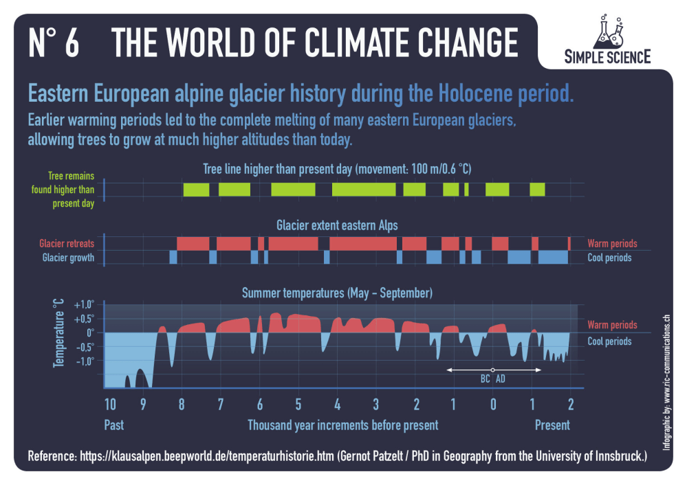 – N° 1 600 million years of global temperature change – N° 2 Earth‘s temperature record for the last 400,000 years – N° 3 Holocene period and average northern hemispheric temperatures – N° 4 140 years of global mean temperature – N° 5 120 m of sea level rise over the past 20‘000 years – N° 6 Eastern European alpine glacier history during the Holocene period.