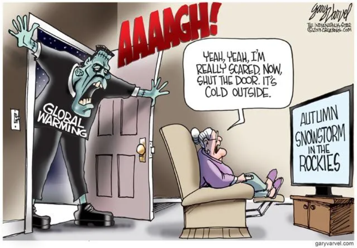 In the excerpt above, the article tells us that 1.5 degrees C is where Mother Earth will strike back by killing many or most of her human parasites. But if the mechanism by which we got to 1.1 degrees warmer is the greenhouse effect from CO2, isn’t it certain that there will be an additional 0.4 degrees of warming? Even if human C02 emissions went to zero tomorrow, wouldn’t there be enough CO2 in the atmosphere to keep us on the Venusian trajectory?