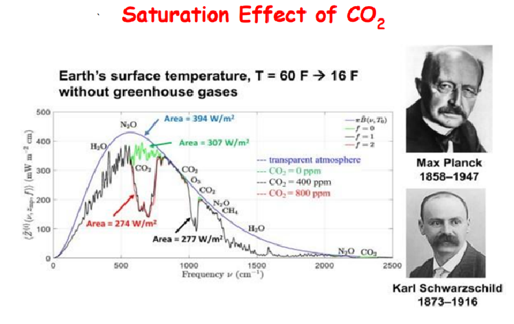 More carbon dioxide will make it a little bit warmer. But carbon dioxide is heavily saturated, to use a technical term. You know, there’s so much in the atmosphere today that if you, for example, could double carbon dioxide, that’s 100% increase, you would only decrease the cooling radiation to space by 1%. So 100% change in carbon dioxide only makes a 1% change in flux. And that’s because of the saturation that I mentioned. And there’s not much you can debate about that. It’s very, very basic physics. It’s the same physics that produces the dark lines of the sun and the stars. So it’s quite well understood.