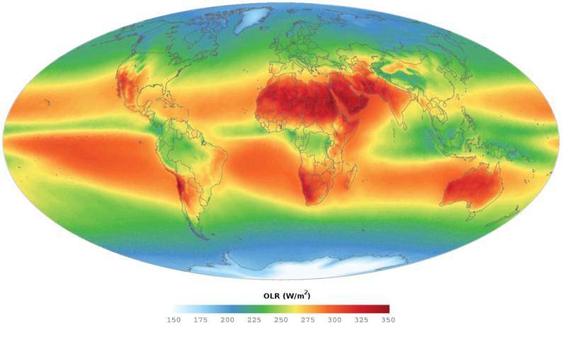 Fig. 1 Global values of mean OLR from 2003-2011 (downloaded August 2, 2017, AIRS OLR 2003-2011 average htpp://mirador.gsfc.nasa.gov/ estimated by Giorgio, G.P., June 24, 2014). The russet areas show regions of greater OLR, with outgoing radiation above the average of ca. 240 W per m2, thus tending to cool the Earth. Note how the upper troposphere above arid continental regions provides a vent for the greatest rate of cooling.
