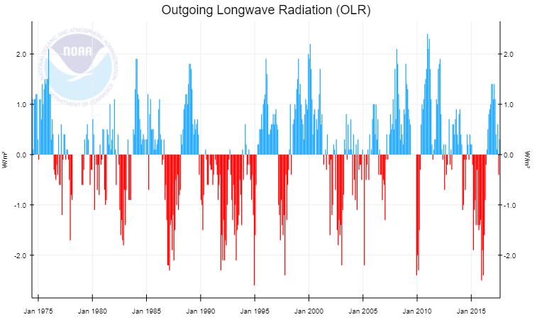 Fig. 3 Satellite measurements of global-zonal OLR (http://www.cpc.ncep.noaa.gov/data/indices/olr NOAA website, downloaded August 20, 2017). The 1998-2000 El Nino peaked at about 1.03 C above the minimum temperature in the preceding La Nina, with zonal OLR varying approximately 4 W/m2; see also (8)